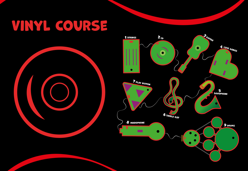 Posters: These posers advertise theme nights at the golf course. Each poster shows off a new theme with three icons that represent that theme.